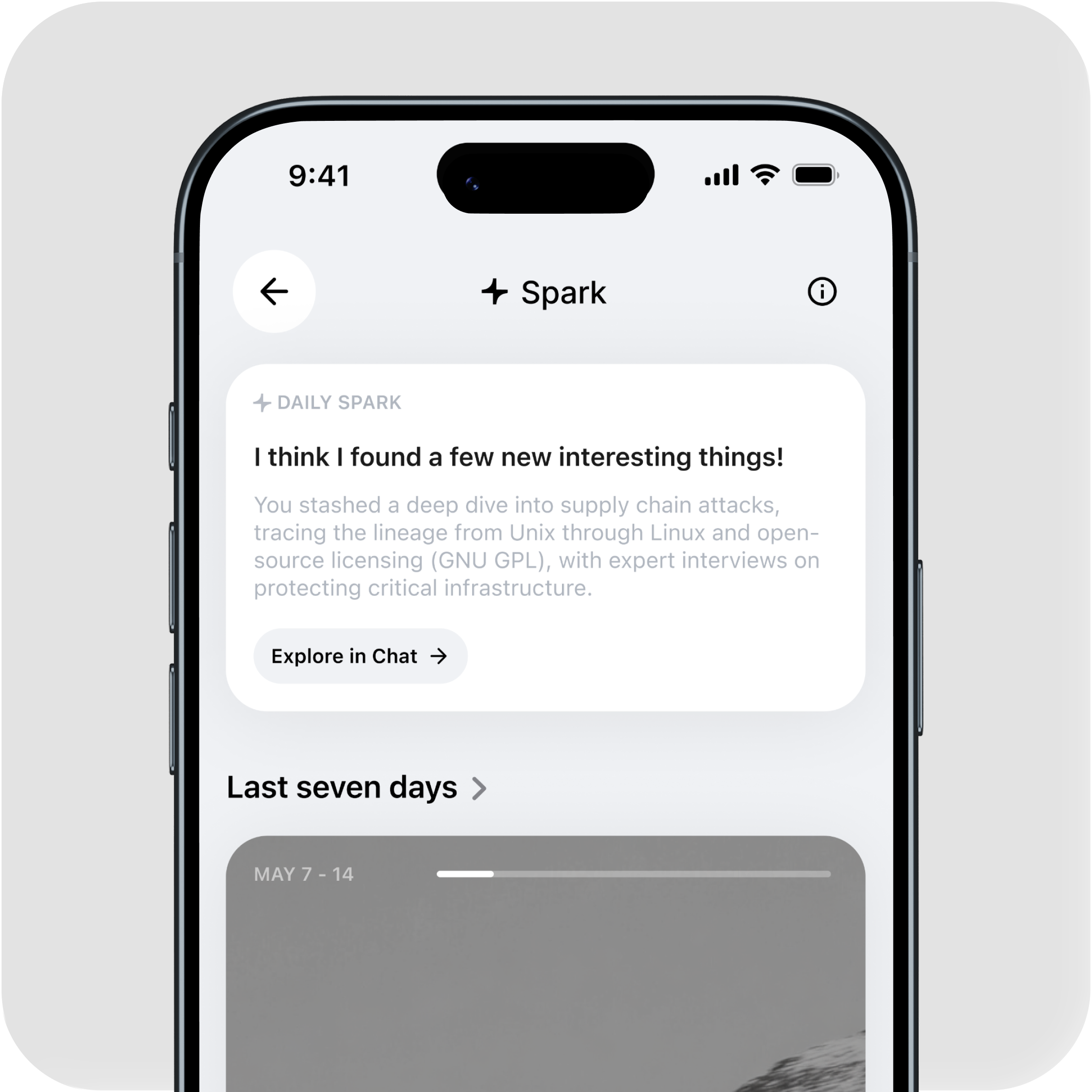 Sparks are intelligent resurfacings: small, well-timed nudges that bring back something you saved when it becomes relevant again. Designed to keep your past curiosity active in your present thinking, rather than letting it fade.